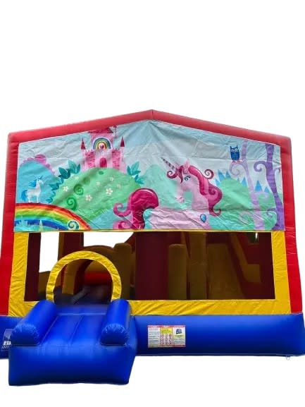 The Extra Large Unicorn Jumping Castle with Slide (5m × 5m Obstacle Slide) is bright, bold, and built for maximum smiles. Fully covered for all-weather play, it combines a huge bouncing area, internal slide, climbing ladder, obstacle pillars, and a bonus basketball hoop. This unicorn-themed inflatable is a show-stopper for birthdays, school fetes and community events across the Gold Coast, Tweed Heads and surrounding suburbs.