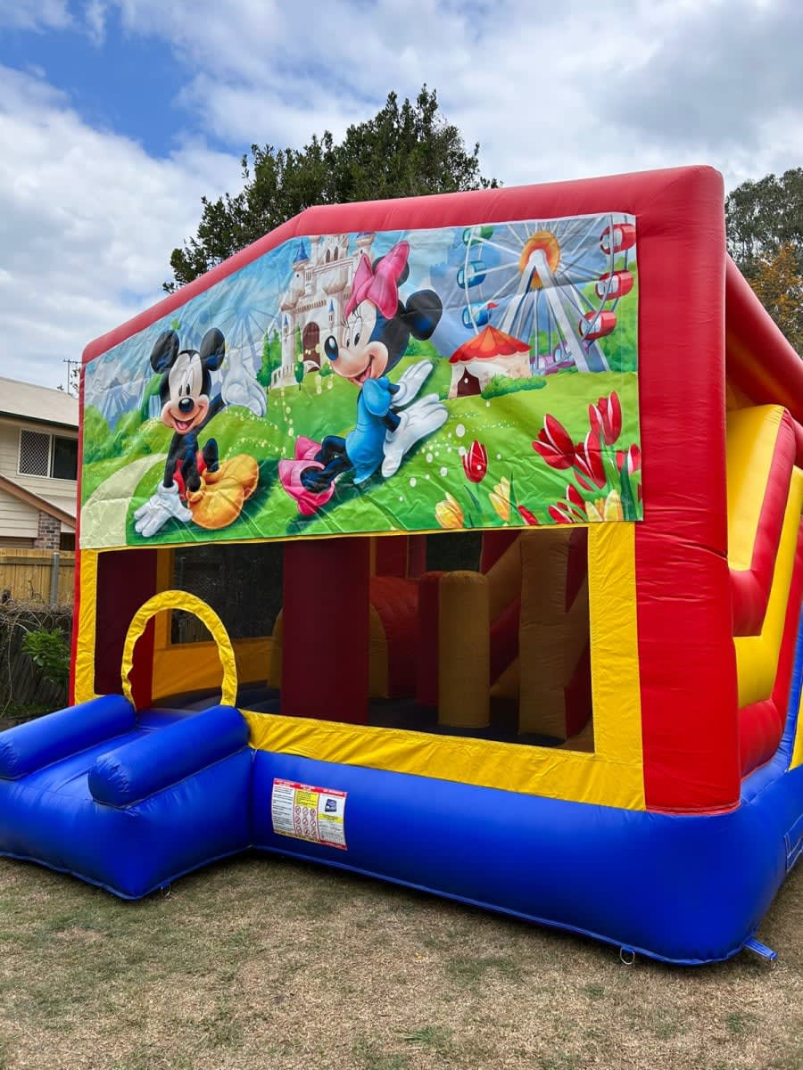Classic character fun with slide, obstacles & full cover — perfect for Mickey & Minnie themed parties.