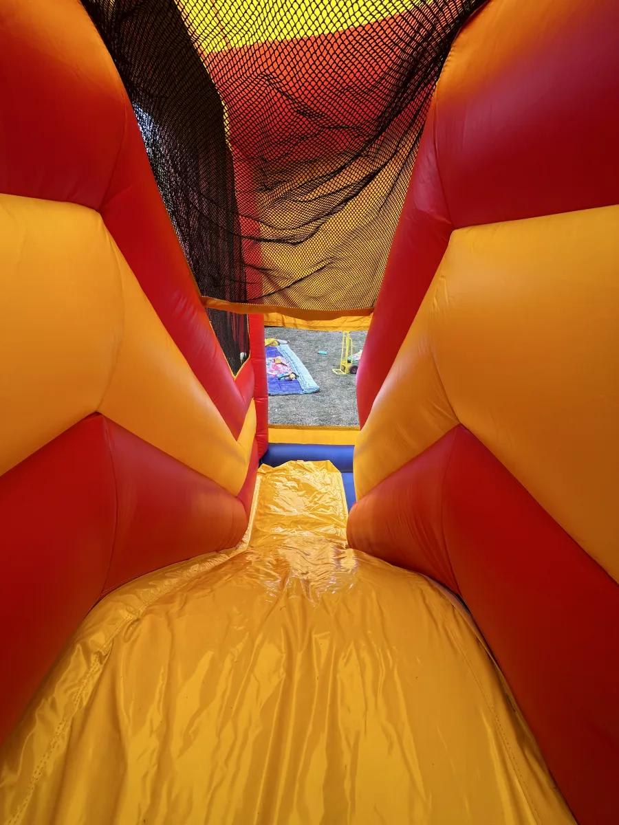 It measures 5m × 5m and includes a bounce area, internal slide, obstacles, ladder and hoop.
