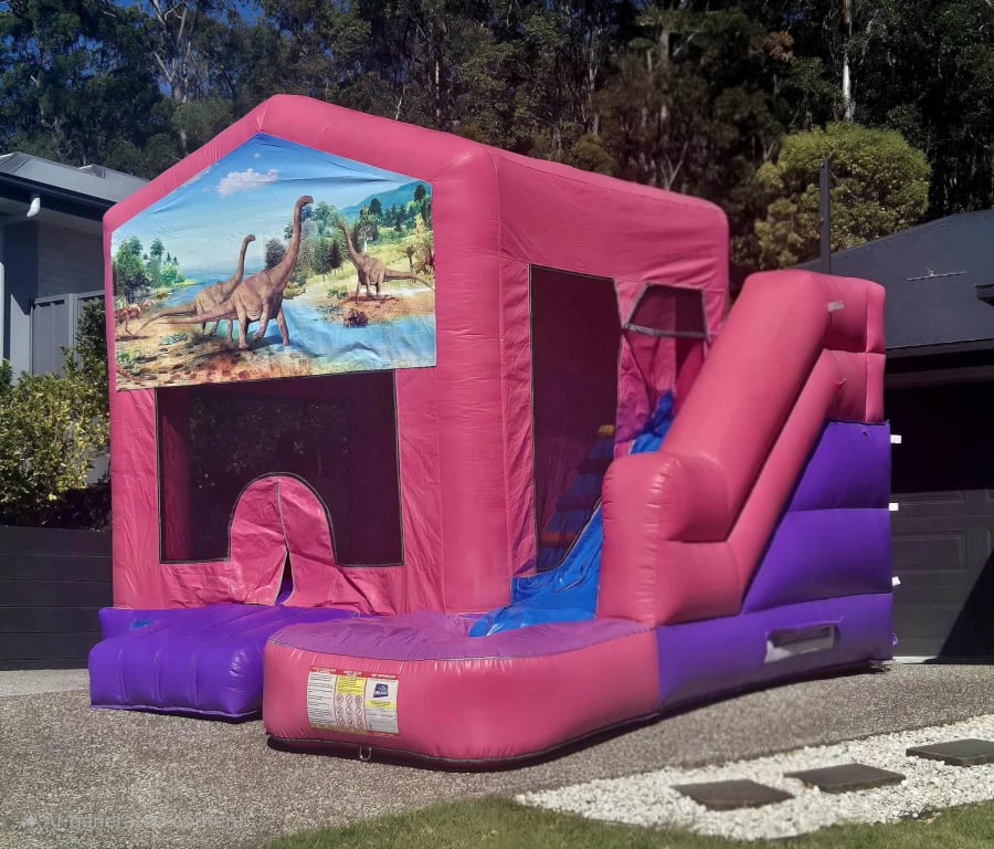 Step back in time with our Dinosaur Pink and Purple Combo Jumping Castle Hire – where fun meets adventure. This vibrant inflatable features a large bouncing area, a climbable ladder, exciting slide, built-in basketball hoop, and eye-catching dinosaur graphics in a unique pink and purple colour theme. Perfect for birthdays, school fetes, and backyard celebrations across the Gold Coast, Tweed Heads and surrounding areas.