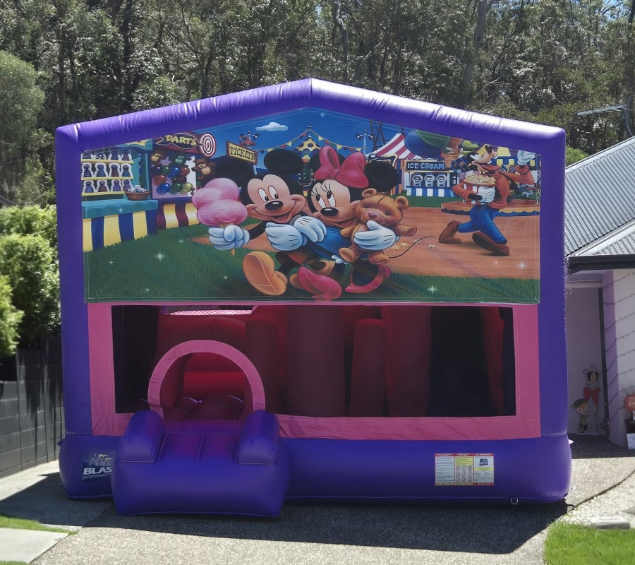 Bring the magic of Disney to your celebration with our Mickey & Minnie Extra Large Jumping Castle Hire — the perfect pink & purple obstacle slide for birthdays and events across the Gold Coast, Tweed Heads and surrounding suburbs. This 5m × 5m obstacle slide is fully covered, keeping kids protected from sun and light rain while offering hours of colourful, character-themed fun. Featuring a bouncing area, climbing ladder, obstacle pillars, internal slide and basketball hoop, it’s ideal for larger parties and community events.