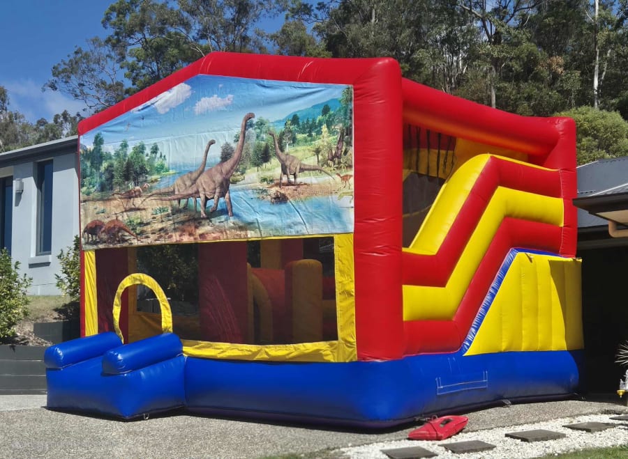 The Extra Large Dinosaur Jumping Castle with Slide (5m × 5m Obstacle Slide) is bigger, bolder, and designed for maximum fun. Fully covered for all-weather play, it combines a huge bouncing area, exciting internal slide, climbing ladder, obstacle pillars, and even a basketball hoop. This dino-themed inflatable is a true crowd-pleaser for birthdays, school fetes and community events across the Gold Coast, Tweed Heads and surrounding suburbs.