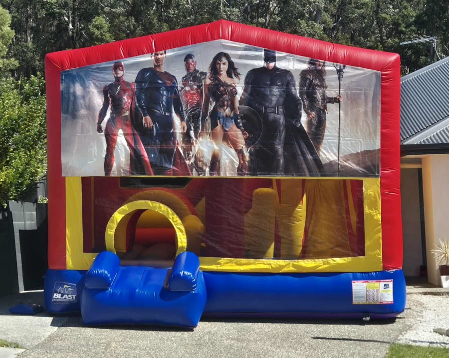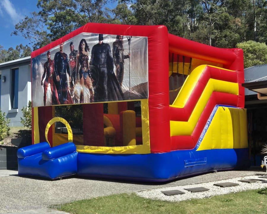 Assemble the heroes with our Justice League Extra Large Jumping Castle Hire — the ultimate superhero inflatable for parties and events across the Gold Coast, Tweed Heads and surrounding suburbs. This 5m × 5m obstacle slide is fully covered, keeping kids protected from sun and light rain while delivering hours of heroic action. Featuring a bouncing area, climbing ladder, obstacle pillars, internal slide, and even a basketball hoop, it’s perfect for larger parties and community events.
