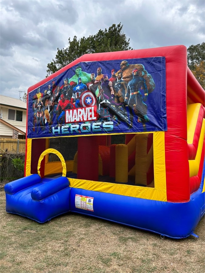 Our Extra Large Superhero Jumping Castle with Slide (5m × 5m obstacle slide) brings comic-book energy to your event. Fully covered for all-weather play, it features a huge bouncing area, internal slide, climbing ladder, obstacle pillars and a bonus basketball hoop. The bold Avengers/Marvel-inspired artwork is a hit at birthdays, school fetes and community events across the Gold Coast, Tweed Heads and nearby suburbs.