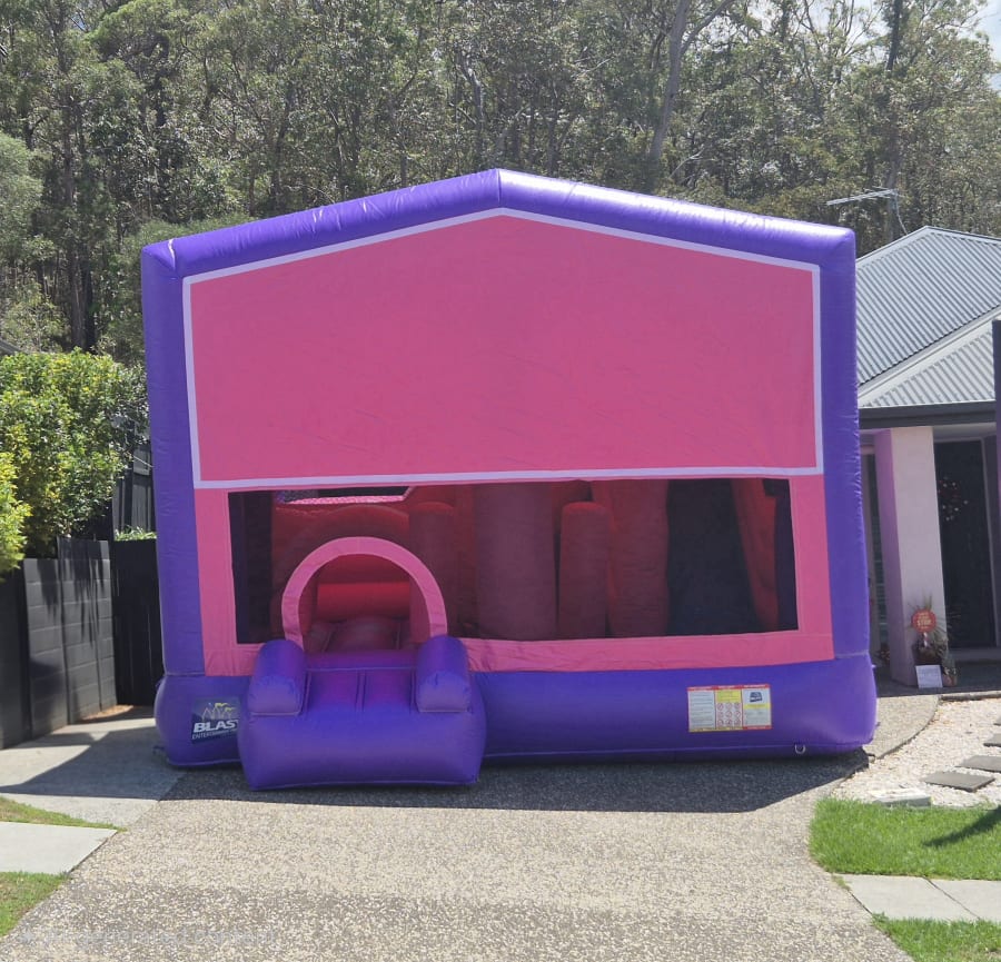 Bold pink & purple styling with slide, obstacles & roof cover — perfect for any theme-free party.