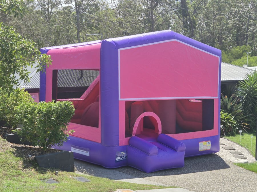 Our Extra Large Pink & Purple Jumping Castle with Slide (5m × 5m Obstacle Slide) delivers maximum fun in a clean, unthemed design that suits any event. Fully covered for all-weather play, it combines a spacious bouncing area with an internal slide, climbing ladder, obstacle pillars and a basketball hoop. A crowd favourite for birthdays, school fetes and community events across the Gold Coast, Tweed Heads and surrounding suburbs.