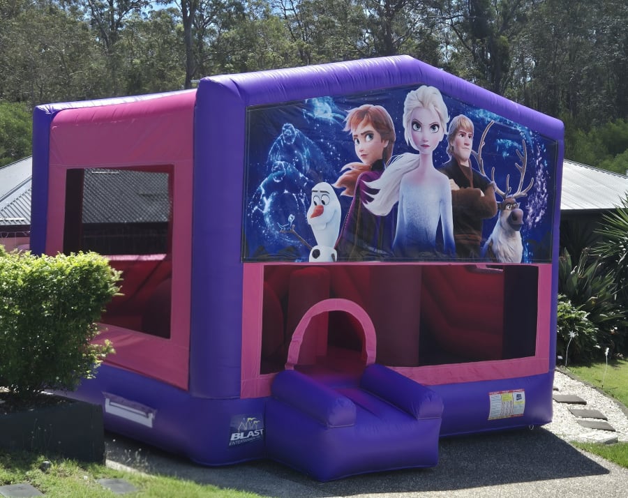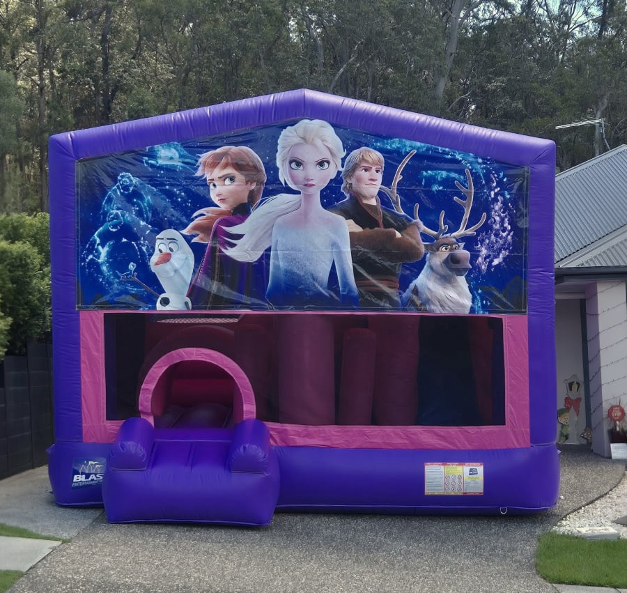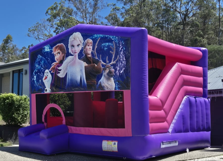 Step into the world of Arendelle with our Frozen Pink Extra Large Jumping Castle Hire — the perfect Frozen-themed inflatable for birthdays and celebrations across the Gold Coast, Tweed Heads and surrounding suburbs. This stunning pink and purple 5m × 5m obstacle slide is fully covered to keep kids protected from sun and light rain while offering endless winter-themed adventures. With a spacious bouncing area, climbing ladder, internal slide, obstacle pillars and a basketball hoop, it brings Frozen magic to every event.