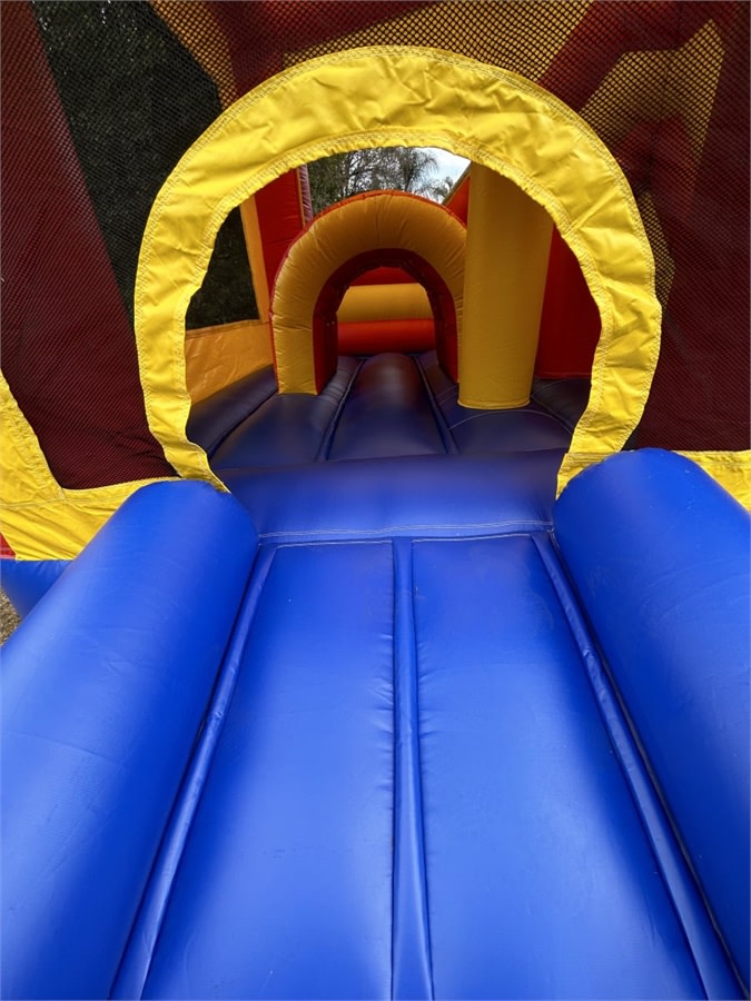It measures 5m × 5m and includes a bouncing area, slide, ladder, obstacles and a basketball hoop.