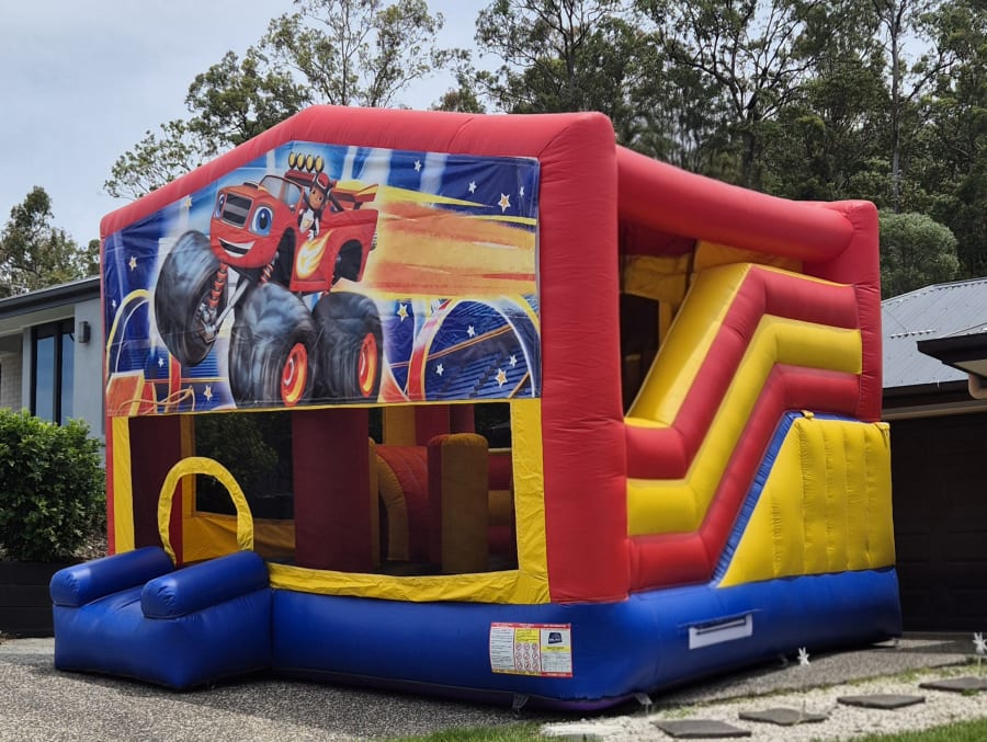 Note: This inflatable uses our classic castle colour base with a Blaze monster truck themed banner on the front.