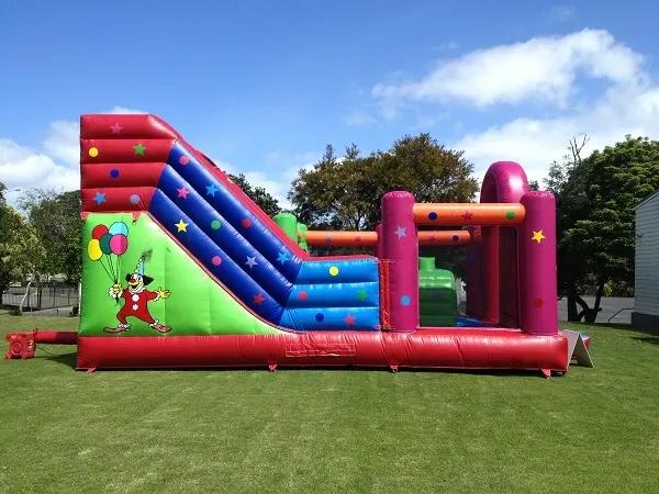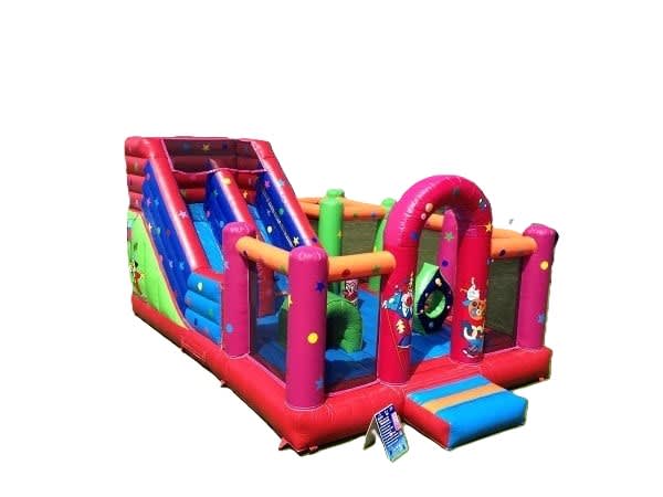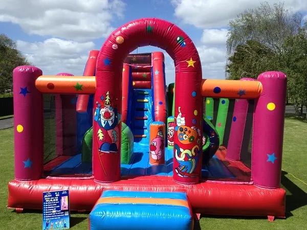 A vibrant 5m × 7m carnival inflatable with slides, obstacles & colourful artwork — fun for all ages!