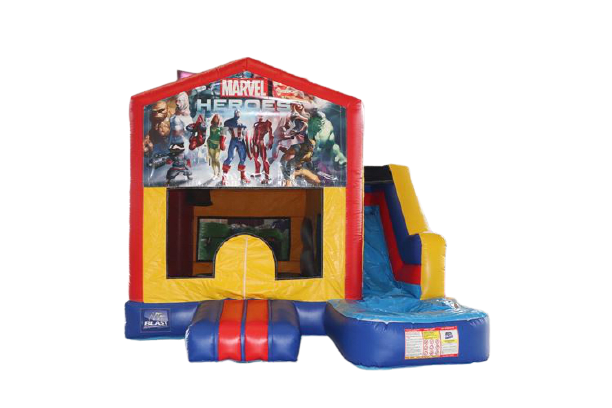 Superhero fun awaits! Medium Marvel-themed inflatable with slide, hoop & climbing fun.