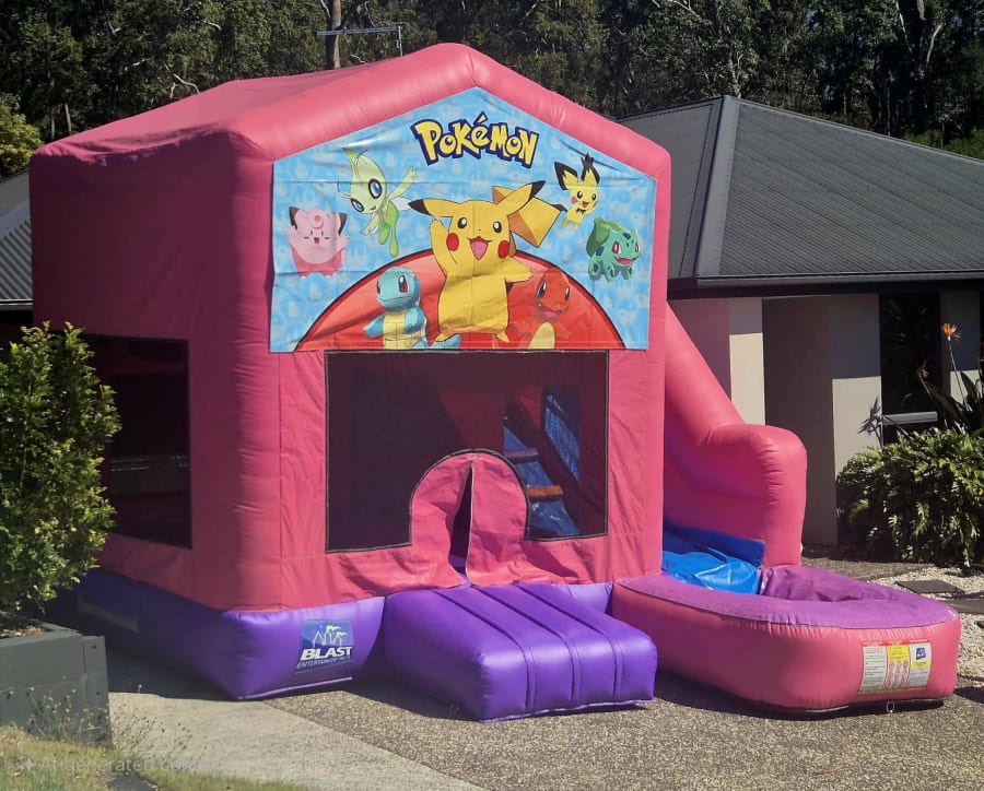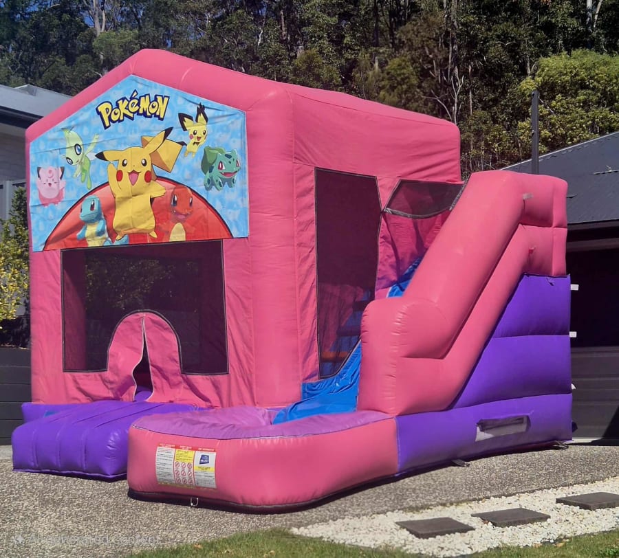 Bring your party to life with our Pokémon Pink & Purple Combo Jumping Castle Hire. This exciting inflatable combines a large bouncing area, climbable ladder, fun slide, and basketball hoop, all surrounded by vivid Pokémon artwork featuring fan-favourite characters. Perfect for birthdays, school events and backyard celebrations across the Gold Coast, Tweed Heads and surrounding areas.