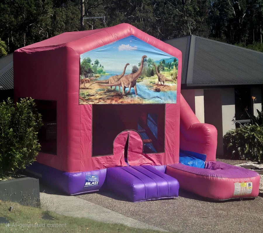 A roaring pink and purple dinosaur-themed combo inflatable for endless fun.