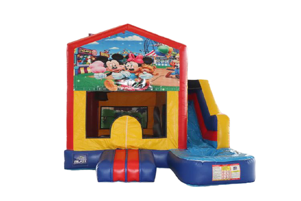 The castle includes a slide, ladder, basketball hoop, spacious bounce area, and full Mickey & Minnie theme.
