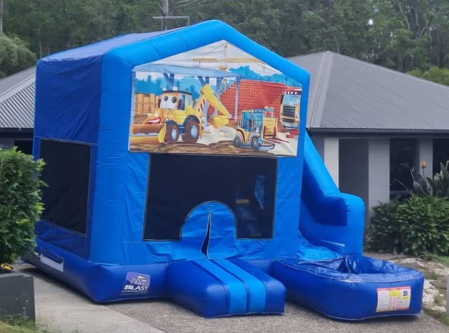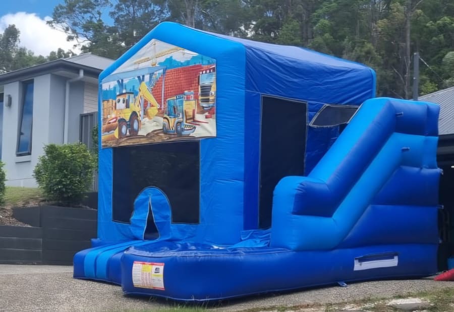 If your little one loves diggers, trucks, and building sites, this one’s a winner. Our Construction themed Medium Combo Jumping Castle with Slide is available for hire across the Gold Coast and Tweed Heads and brings big worksite energy to your party. Kids can bounce in the roomy play zone, climb the adventure ladder, zoom down the slide, and shoot hoops between turns. With a bold light and dark blue base and a fun construction banner, it’s perfect for birthdays, daycare events, and school fun days.