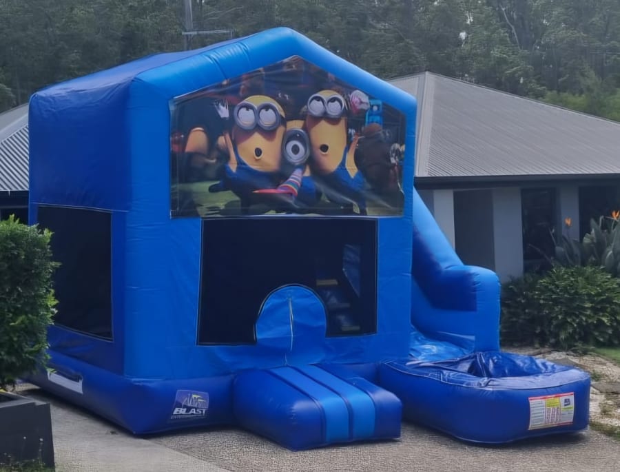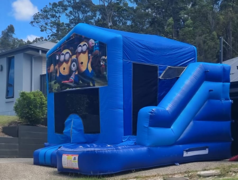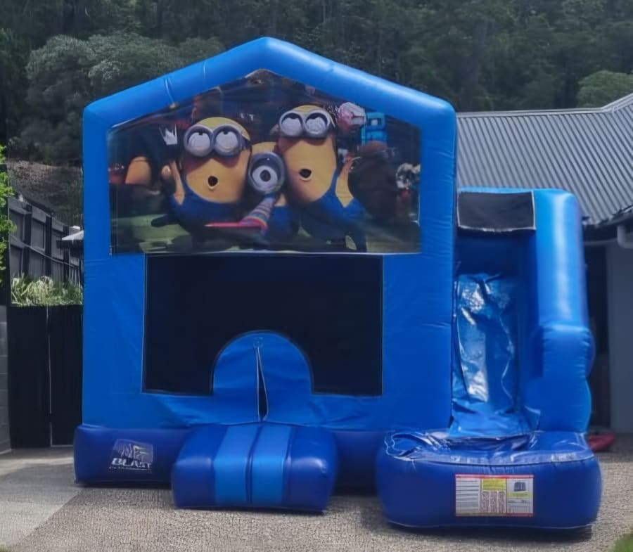 Get ready for giggles and chaos (the fun kind). Our Minions themed Medium Combo Jumping Castle with Slide is available for hire across the Gold Coast and Tweed Heads and is a massive hit with kids. They can bounce in the roomy play zone, climb the adventure ladder, race down the slide, and shoot hoops between turns. With a bold light and dark blue base and a cheeky Minions banner, it’s perfect for birthdays, school events, and backyard parties.