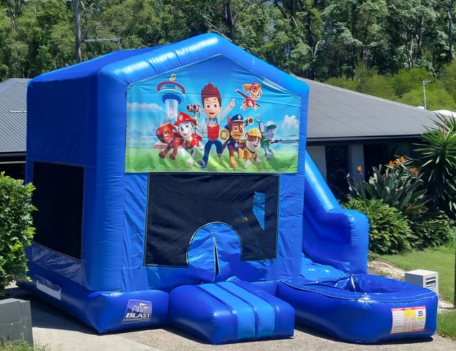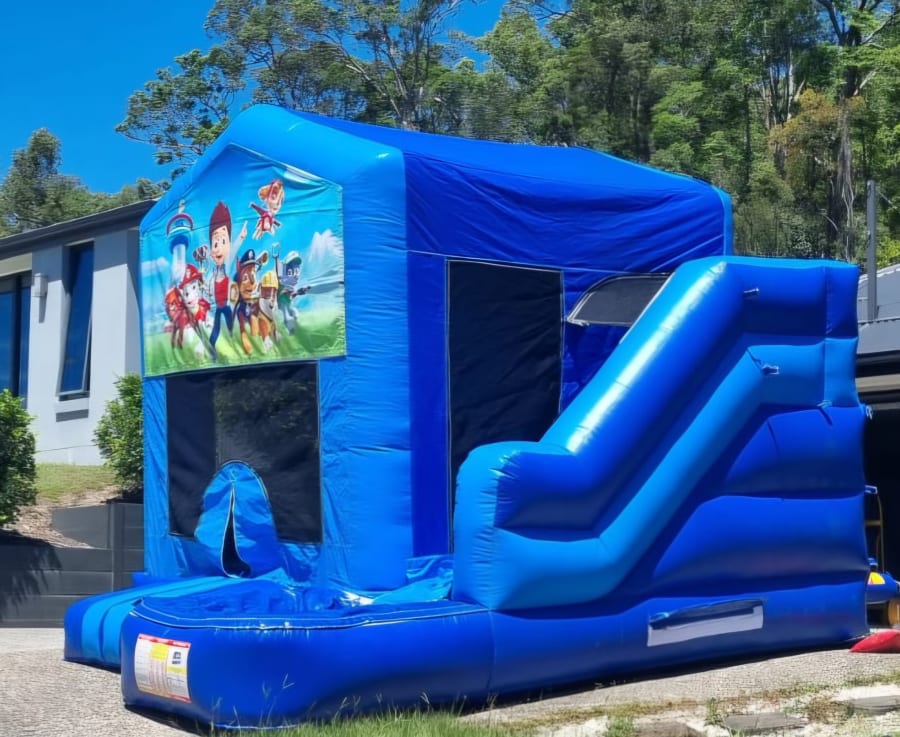 Call the pups, it’s party time. Our Paw Patrol themed Medium Combo Jumping Castle with Slide is available for hire across the Gold Coast and Tweed Heads and is a favourite for younger kids’ birthdays. They can bounce in the roomy play zone, climb the adventure ladder, zoom down the slide, and shoot hoops between turns. With a bold light and dark blue base and a fun Paw Patrol banner, it’s perfect for birthdays, daycare events, and family fun days.