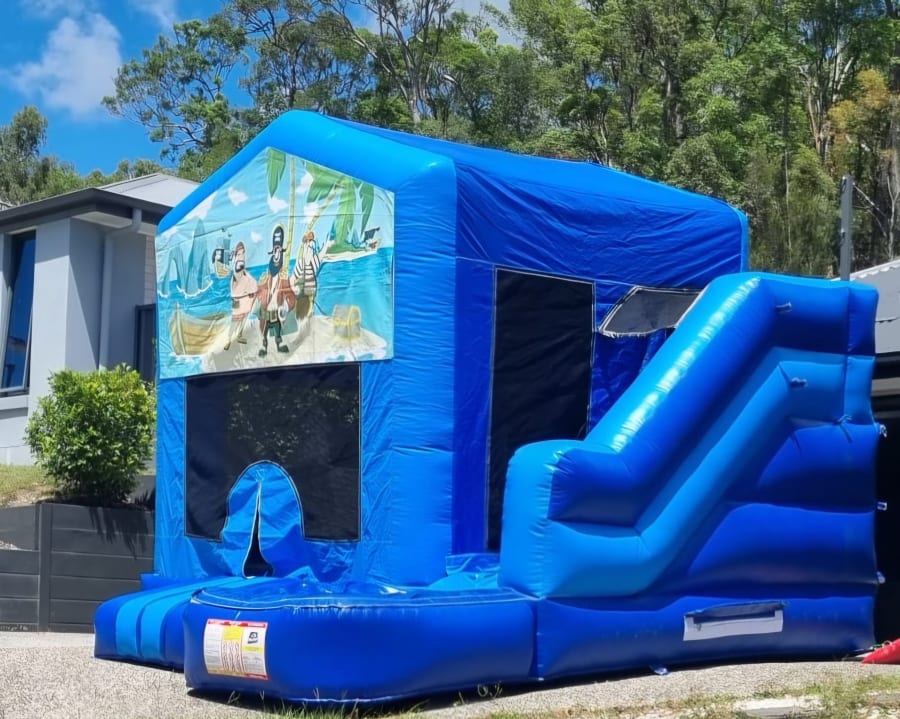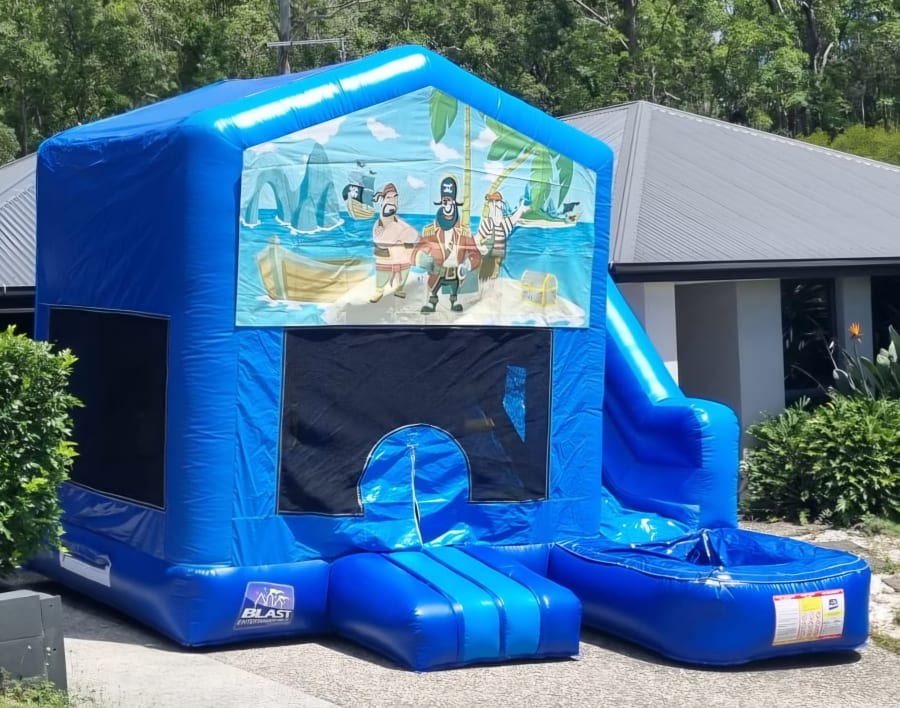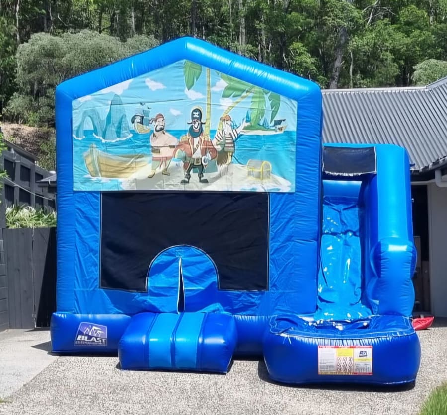 Set sail for an epic party. Our Pirate themed Medium Combo Jumping Castle with Slide is available for hire across the Gold Coast and Tweed Heads and is perfect for little adventurers. Kids can bounce in the roomy play zone, climb the adventure ladder, zoom down the slide, and shoot hoops between turns. With a bold light and dark blue base and a swashbuckling pirate banner, it’s a ripper choice for birthdays, school events, and backyard parties.