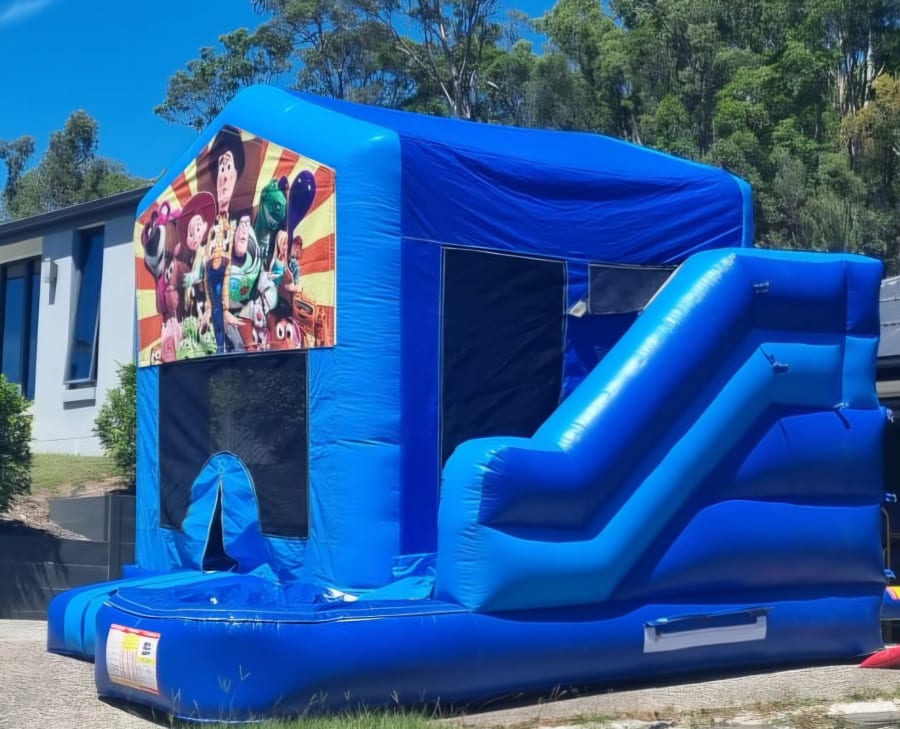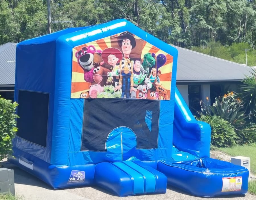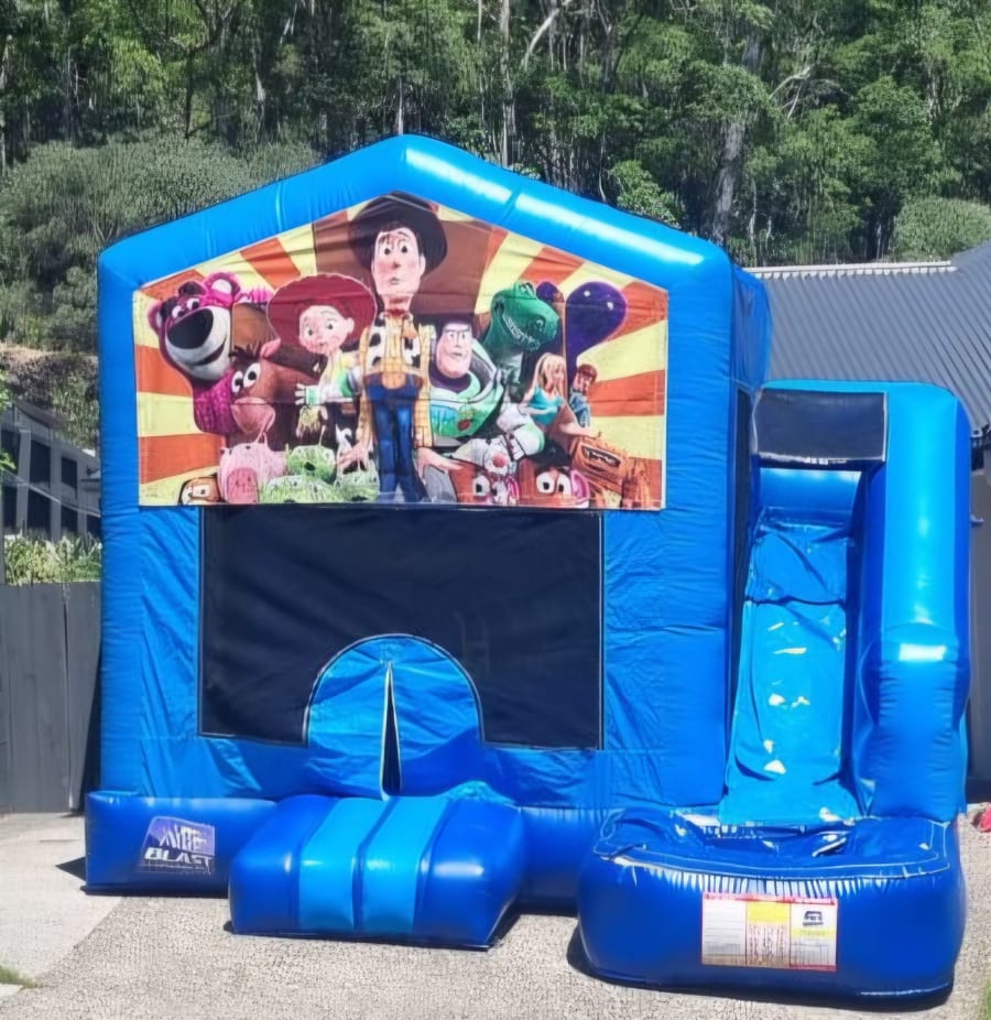 Take your party to infinity and beyond with our Toy Story themed Medium Combo Jumping Castle with Slide, available for hire across the Gold Coast and Tweed Heads. Kids can bounce in the spacious play zone, climb the adventure ladder, zoom down the slide, and shoot hoops between turns. With a bold light and dark blue base and a fun Toy Story banner, it’s a top pick for birthdays, daycare events, and school fun days.