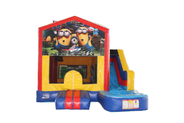 It has a bounce zone, slide, climbing ladder, and basketball hoop, all with Minions artwork.