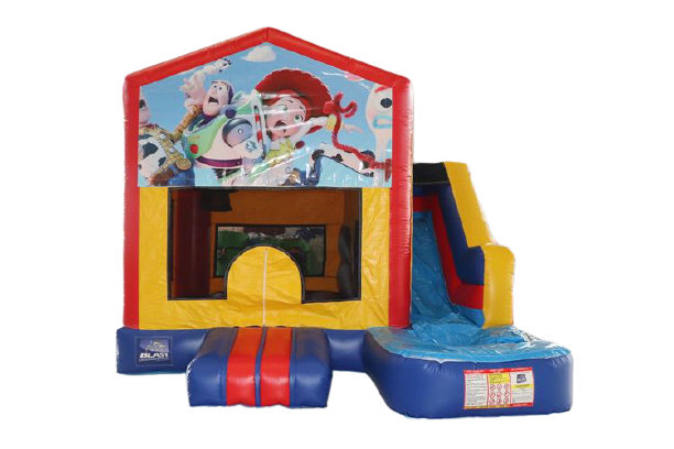 The Toy Story inflatable includes a slide, climbing ladder, basketball hoop and large bouncing area.