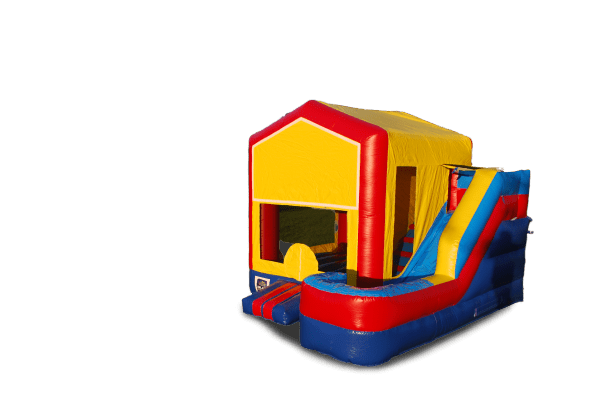 Our most popular yellow & blue combo castle – slide, bounce & climb fun for kids’ parties!