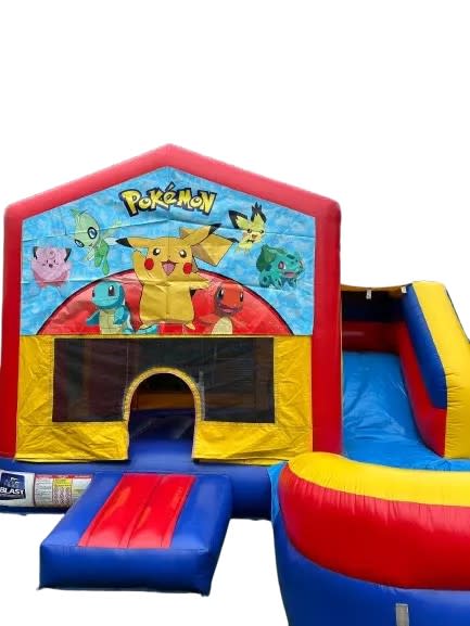 Catch the fun! A colourful inflatable with slides, hoop & Pokémon artwork.