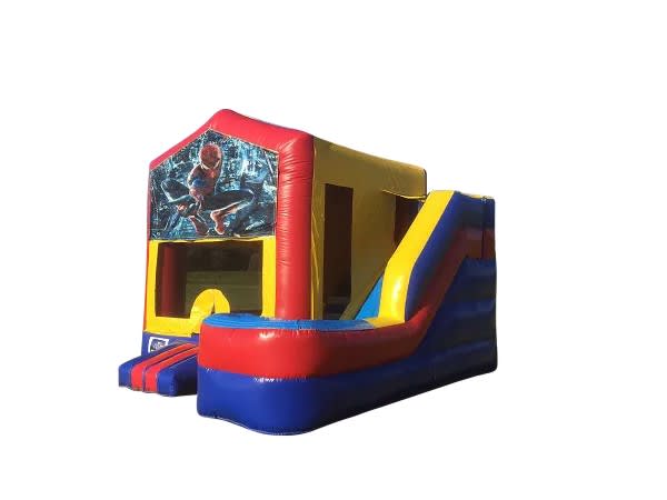 A large bouncing area, slide, climbing ladder, and basketball hoop — all in a bright Spider-Man theme.