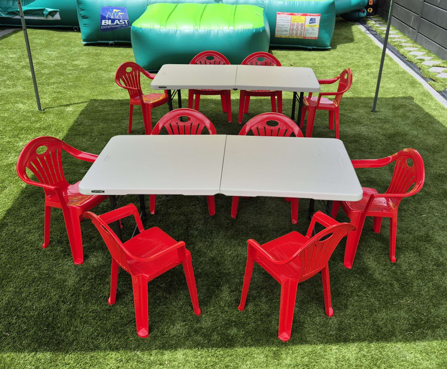 Make your little one’s celebration even more fun with our Kids’ Table & Chairs Hire. Designed specifically for toddlers aged 1–4 years (maximum weight 15kg per chair), this child-sized set is ideal for birthday parties, meal breaks, cake cutting and arts & crafts. Each package includes a sturdy fold-up table and six matching chairs, giving young guests a comfortable space to sit, eat and enjoy the party.
