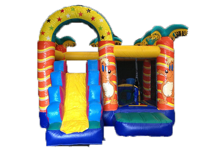 Bring the island vibes — bright, tropical fun with a slide & obstacles inside.